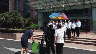 當(dāng)天上午一大早,同事們已經(jīng)做好了拍攝的準(zhǔn)備工作,換好衣服,化好妝,長發(fā)扎起。雖是早上,太陽的威力可一點(diǎn)不弱,同事們長衣長褲站在太陽底下,從鏡頭里看起來很專業(yè)干練,但那滋味真是——誰曬誰知道,雙眼皮里都是汗水。在太陽下站一會兒,就覺得皮膚發(fā)燙,加上穿著黑色長褲黑皮鞋,格外吸熱。