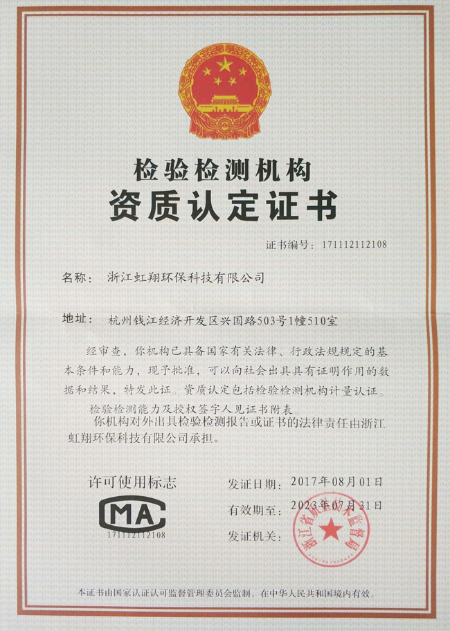 獲得中國計量認證的認可,也充分體現了虹翔環保科技有限公司的“獨立公正、規范準確、嚴謹科學”的質量方針以及規范的質量管理體系和卓越的服務品質。也表明了虹翔環保科技有限公司在實驗室管理、儀器設備和人員等各個方面達到了更高的管理水平。