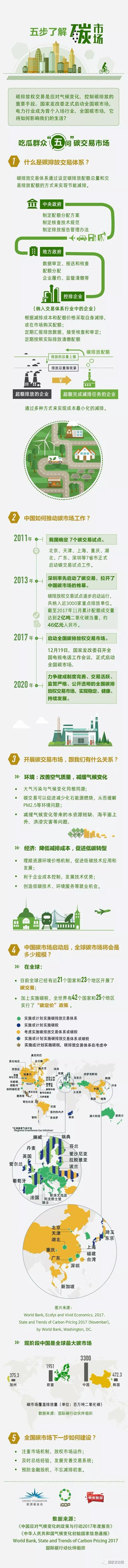 12月19日,國家發改委副主任張勇在全國碳排放交易體系啟動工作新聞發布會上表示,經國務院同意,國家發改委印發了《全國碳排放權交易市場建設方案(發電行業)》,標志著中國全國碳排放交易體系已完成總體設計并正式啟動。下面,通過一張圖《五步了解碳市場》。